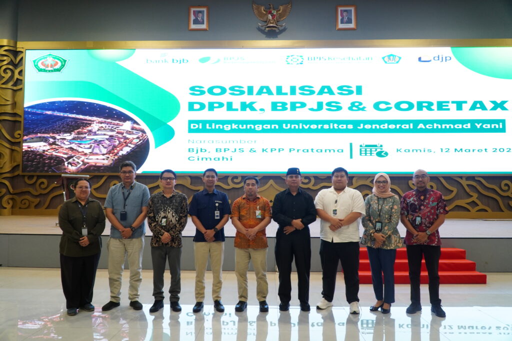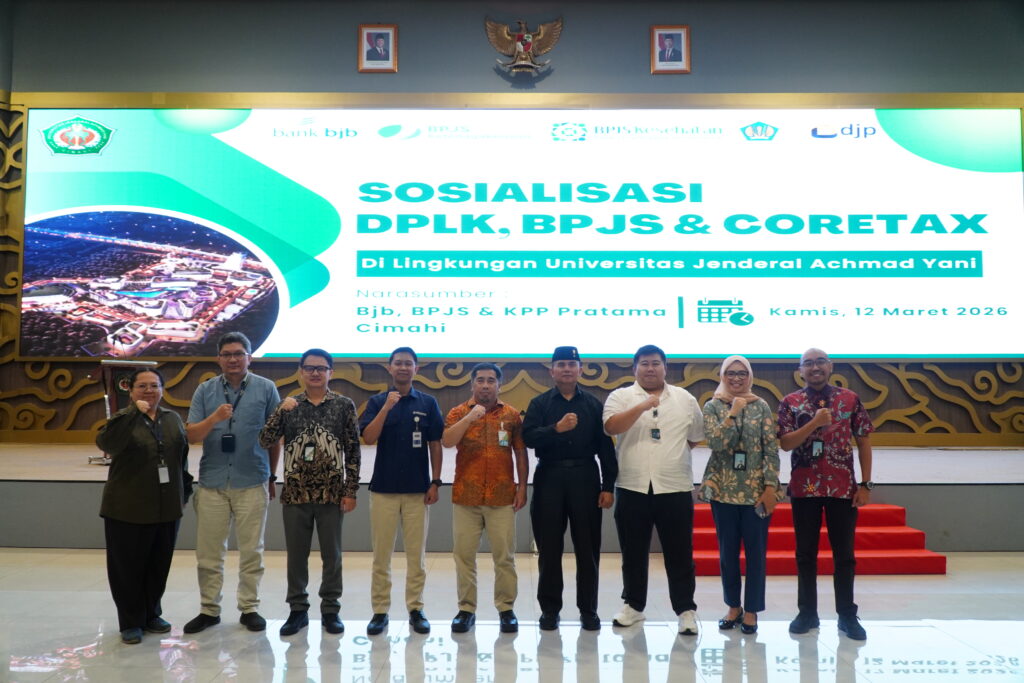 Humas – Universitas Jenderal Achmad Yani (Unjani) menggelar sosialisasi tentang Dana Pensiun Lembaga Keuangan (DPLK), BPJS, serta sistem Coretax kepada seluruh pegawai universitas. Acara yang berlangsung pada Kamis, 12 Maret 2026 ini bertempat di Auditorium Unjani dan dihadiri langsung oleh Rektor Unjani beserta jajaran pimpinan, para dekan, serta ratusan pegawai di lingkungan universitas.